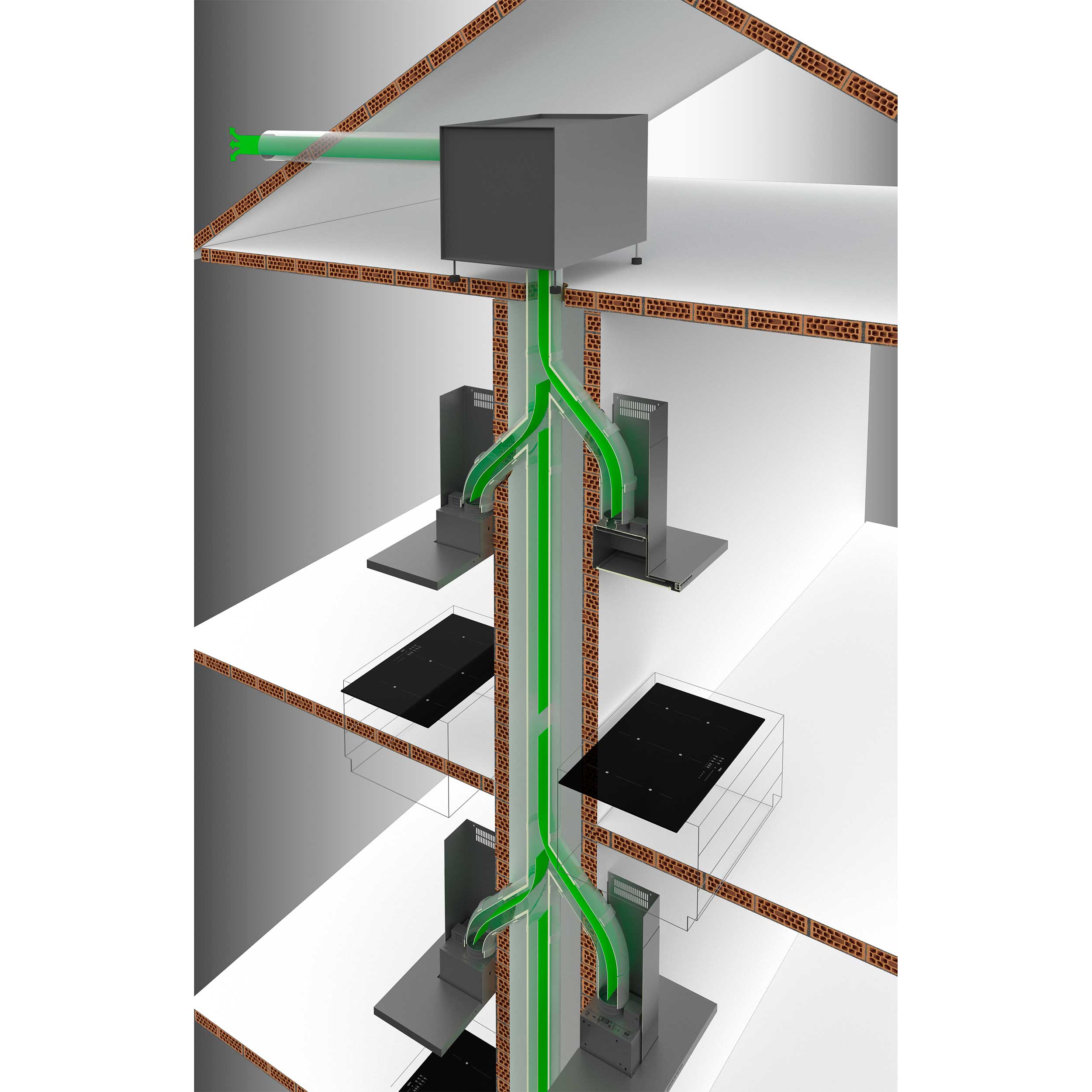 För Centralventilation Med central ventilation ansluts fläkten till en centralt placerad motorenhet. Detta används oftast i bostäder där en gemensam central fläkt suger från fler lägenheter. Fläkten fungerar i samband med central ventilation på vanligt vis med ett grundsug och ett forcerat sug
