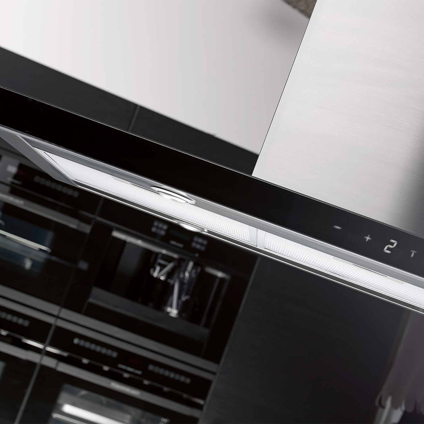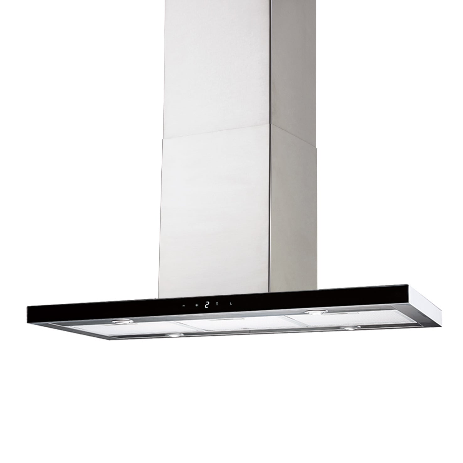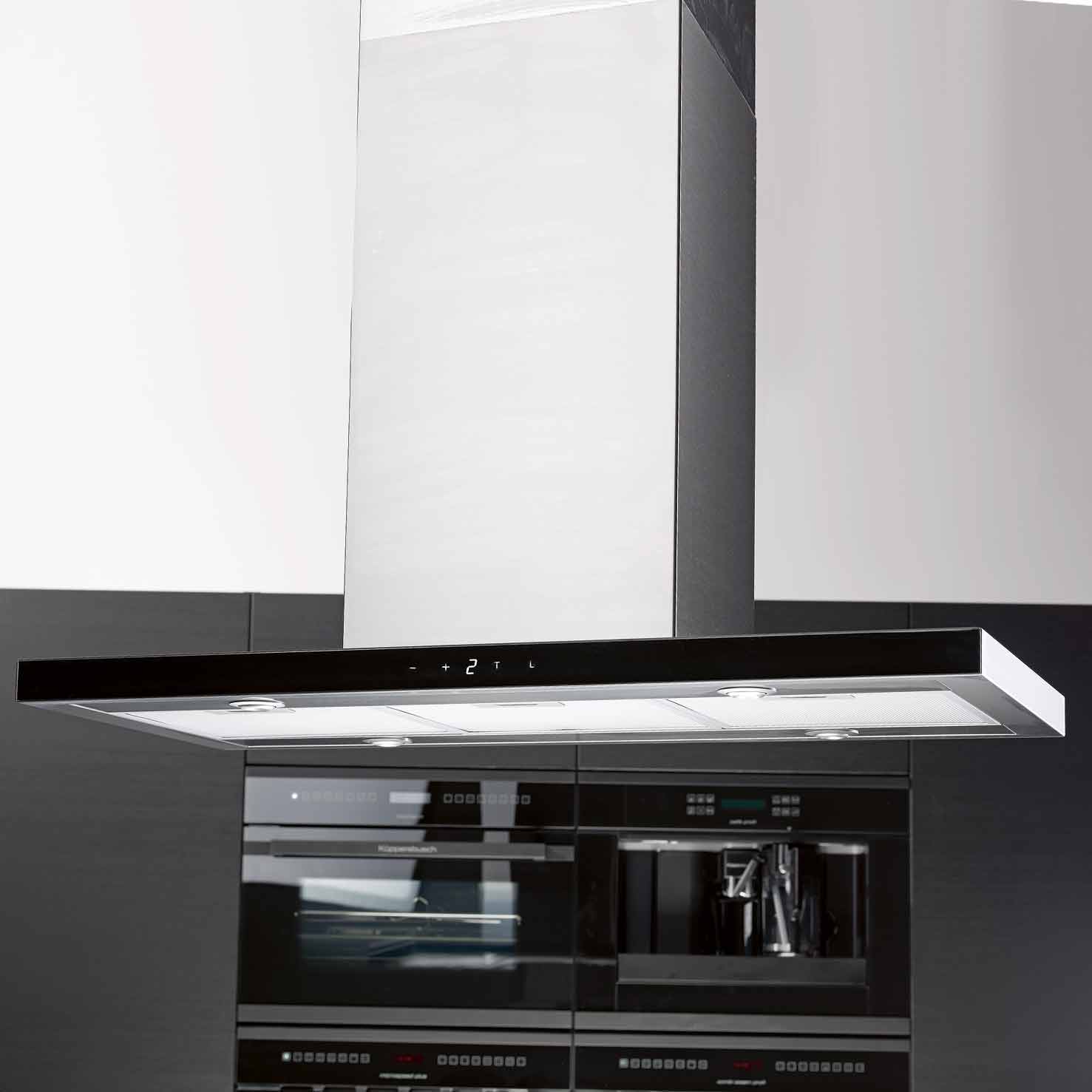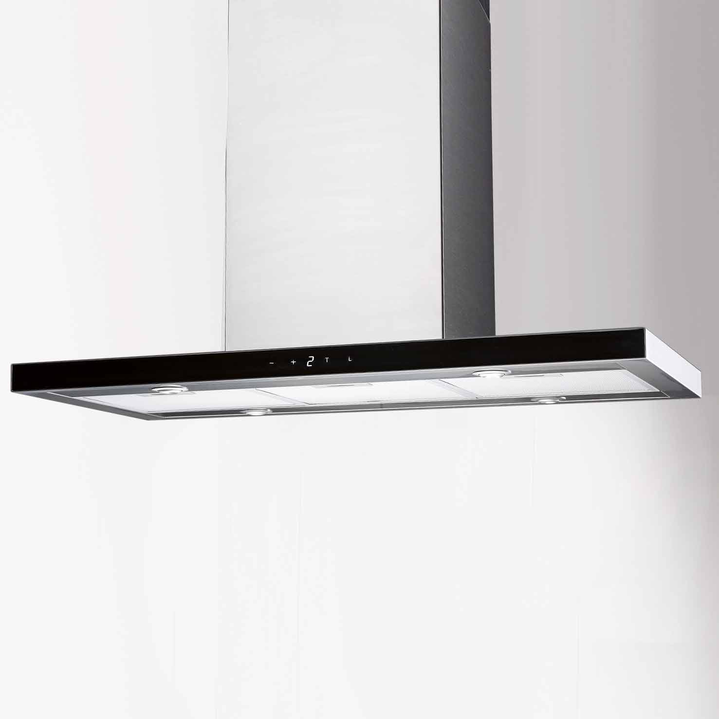 Frihängande köksfläkt. Med extern motor för invändig montering - Rostfritt stål / svart glas - 900mm