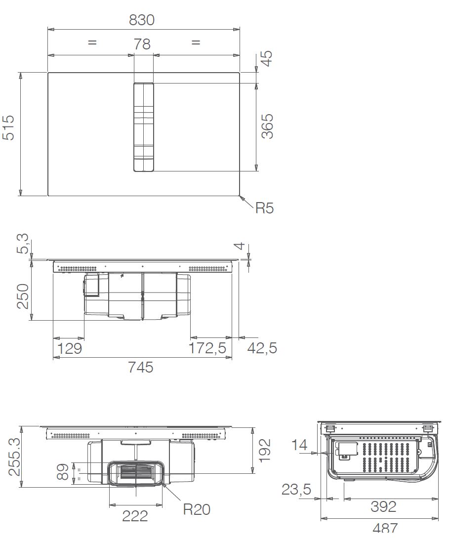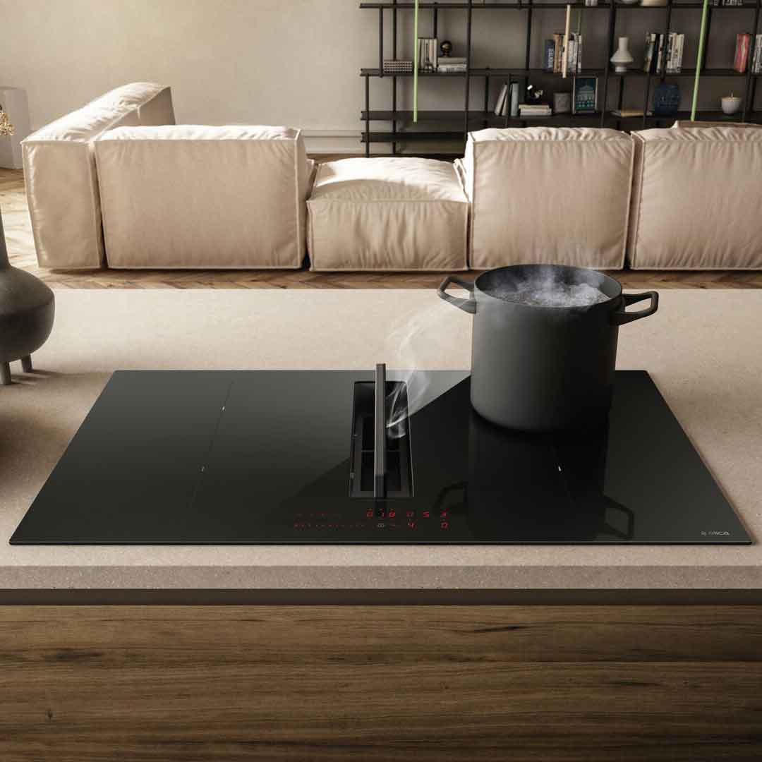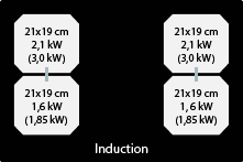 2 kokzoner: 21 x 19cm / 2.100 W (3.000 W) + 2 kokzoner: 21 x 19cm / 1.650 W (1.850 W). Denna modell levereras utan rörpaket. Hällen har rundade hörn och man kan välja att installera den, antingen ovanpåliggande eller planmonterad. Den intelligenta styrningen justerar sugstyrkan, beroende på hur många av hällens zoner som är igång och på vilken nivå de är inställda på.