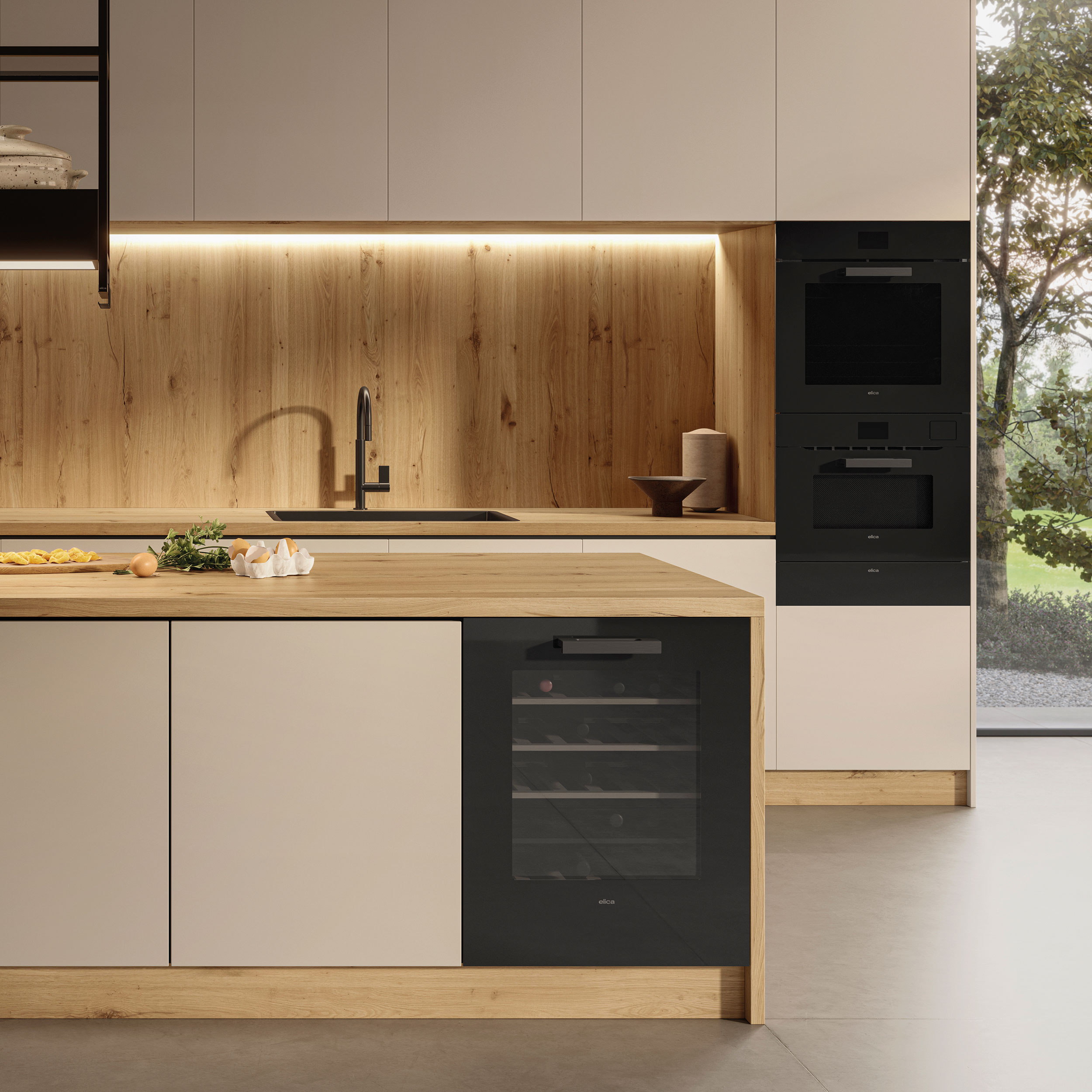 Rummeligt vinkøleskab med kapacitet til 36 flasker. To separate temperaturzoner til rød- og hvidvin. Elegant sort glasfront med UV-beskyttelse og vibrationsdæmpning for skånsom opbevaring.