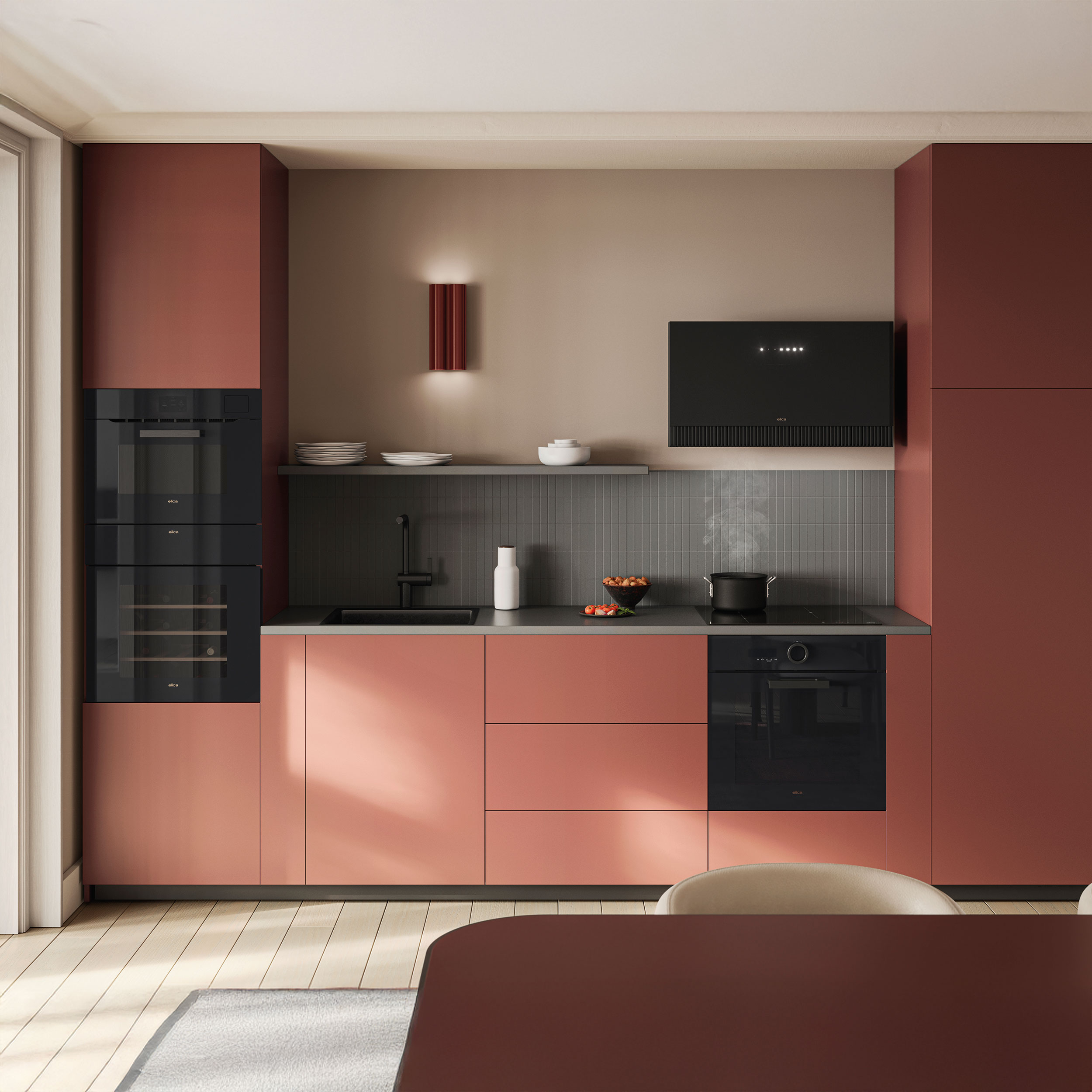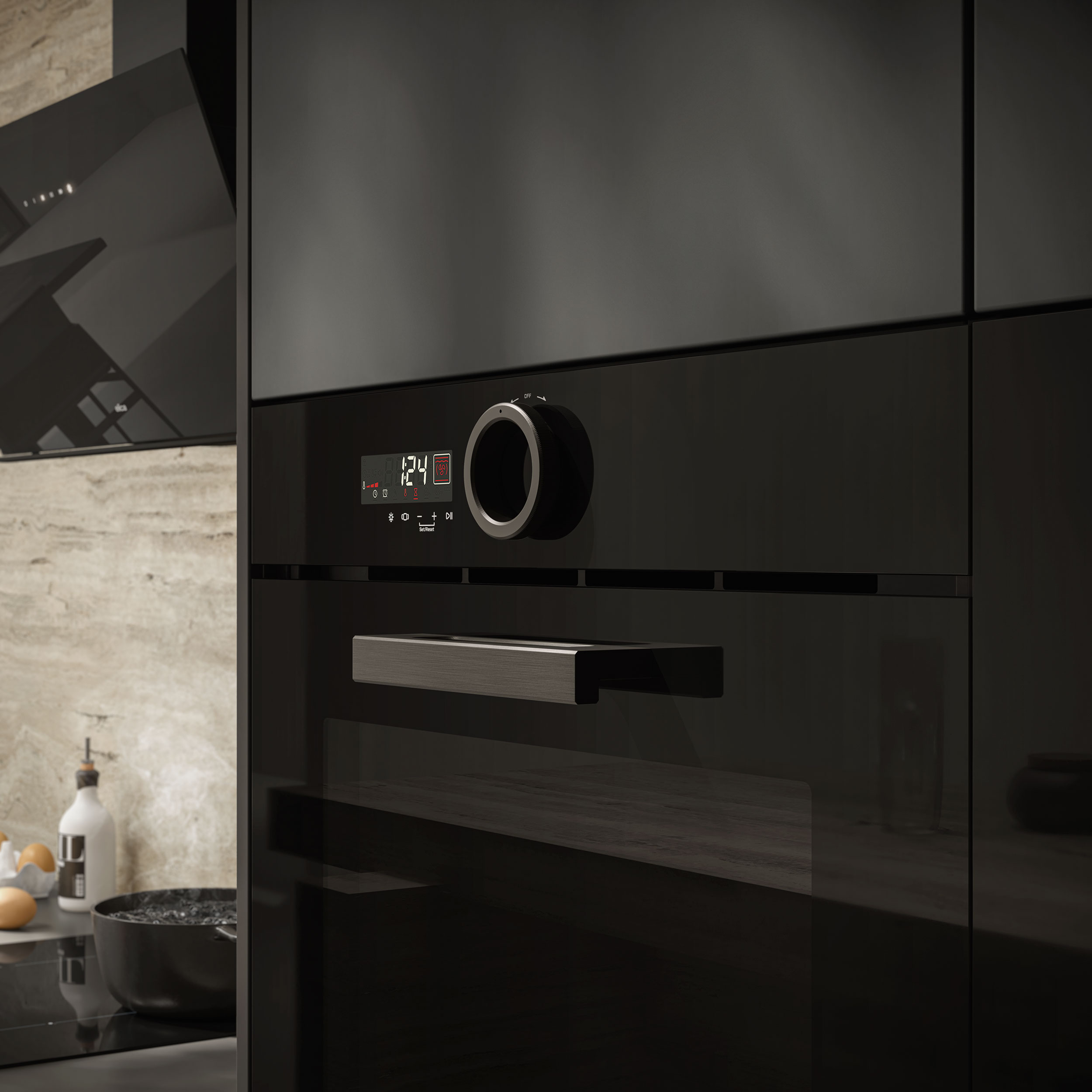 - Fullständigt svart glasdesign och minimalistisk estetik