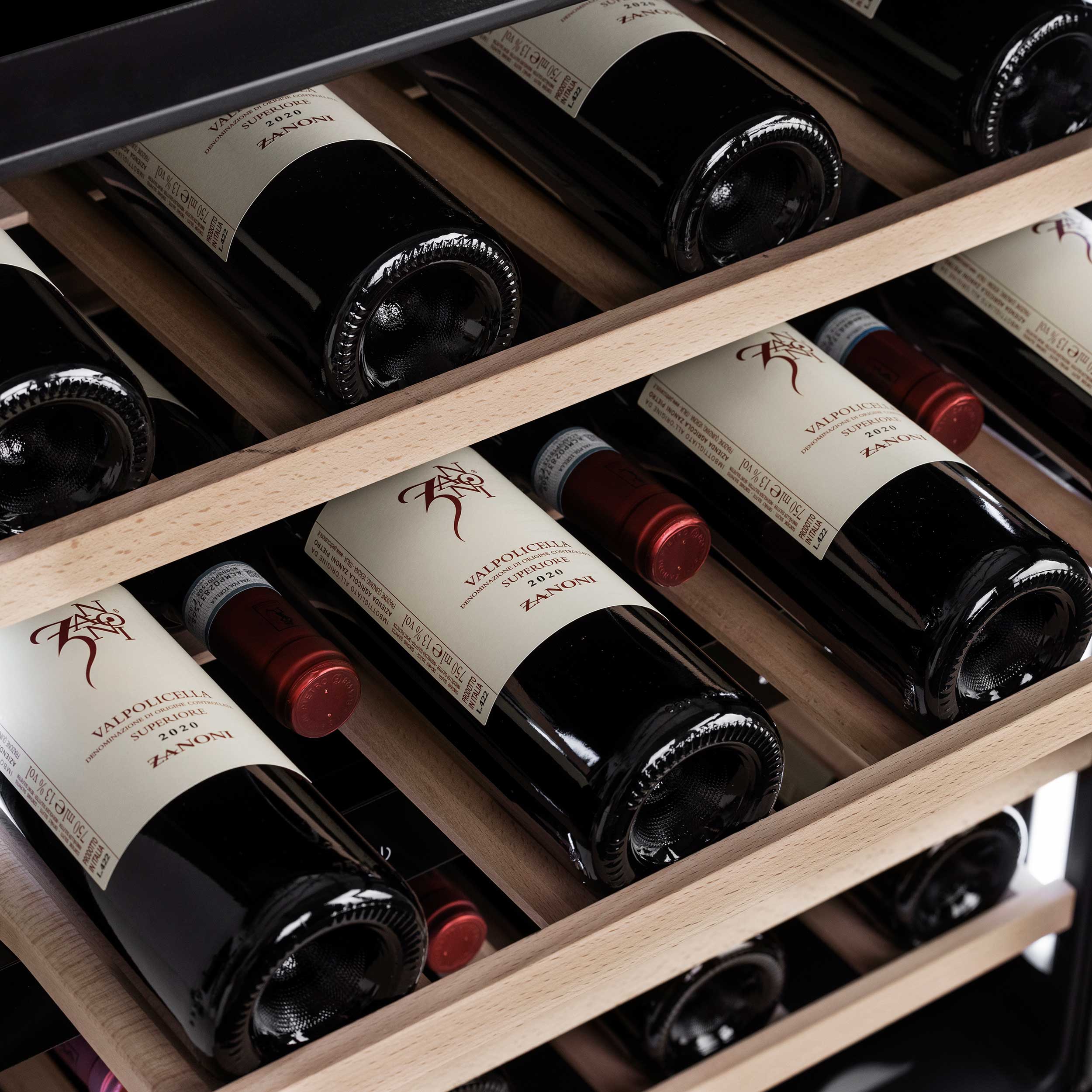 Vinkylskåpets fläkt (vanligtvis på större skåp) säkrar att den kalla luften cirkuleras runt i zonen och kylningen med kompressorteknologi säkrar en konstant och jämn temperatur.